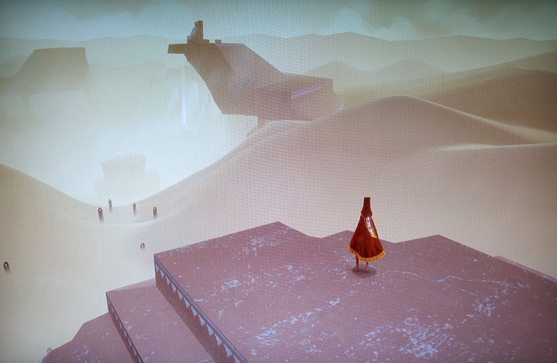 What's the plot? You're a little chap or lady trudging through the desert on your rendezvous to a shining mountain in the distance. It starts off with an Arabic feel and then abruptly turns into a Tibetan pilgrimage, so on a spiritual level it's eclectic. I bet you any money there's at least someone who believes that Journey is fundamentalist Islamic propaganda.